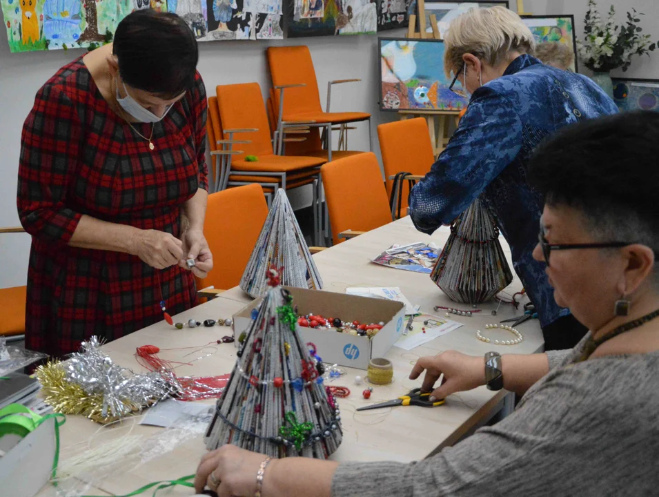 Pod okiem instruktorki Małgorzaty Król-Smagały uczestnicy warsztatów dali nowe życie starym gazetom. Zamiast trafić do kosza na śmieci, gazety stały się wyjątkowymi choinkami. Przyozdobione niepotrzebnymi z pozoru koralikami czy wstążkami, nabrały niepowtarzalnego charakteru. Na nadchodzące święta będą jak znalazł!