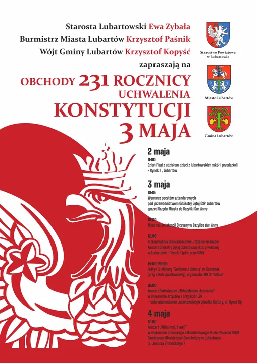 17.00 – Koncert „Witaj Maj, 3 Maj” w wykonaniu Dziecięcego i Młodzieżowego Studia Piosenki PMDK – Powiatowy Młodzieżowy Dom Kultury w Lubartowie, ul. Juliusza Słowackiego 7
