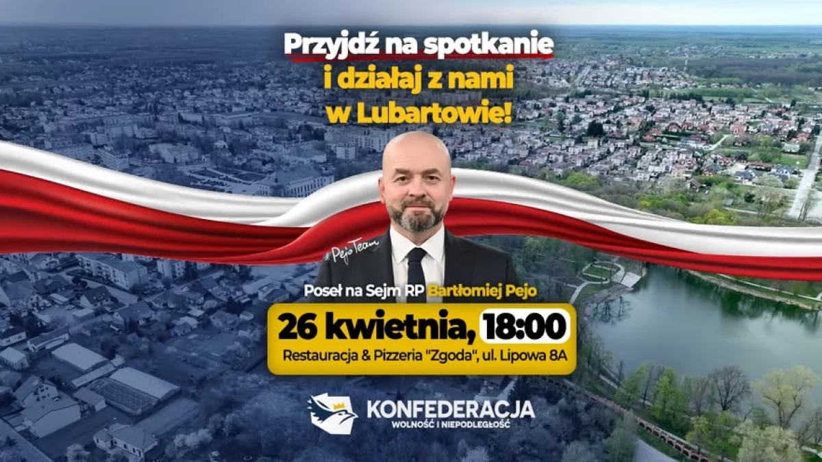 Poseł Bartłomiej Pejo przyjedzie do Lubartowa w niedzielę 26 kwietnia. Spotkanie z nim rozpocznie się o godz. 18 w Restauracji & Pizzerii„Zgoda”, ul. Lipowa 8A.