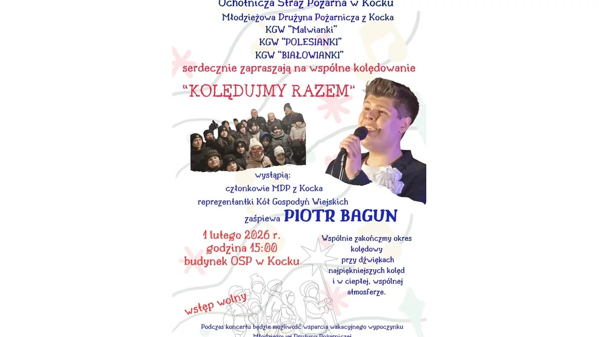 Na kolędowanie w remizie OSP w Kocku zapraszają OSP w Kocku, Młodzieżowa Drużyna Pożarnicza z Kocka, KGW Malwianki, KGW Polesianki, KGW Białowianki. Zaśpiewa też znany m.in. z programu "Szansa na sukces" utalentowany wokalista Piotr Bagun.