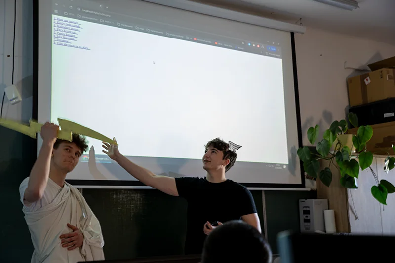 Zeus, Atena, Hermes, Piękna Helena i całkiem swojska Sprzątaczka to bohaterowie przedstawienia, które przygotowali uczniowie Technikum Zawodowego w ZS 2. Oprawę muzyczną przygotował Alex z klasy 4T. Prowadzącym był Kamil.
