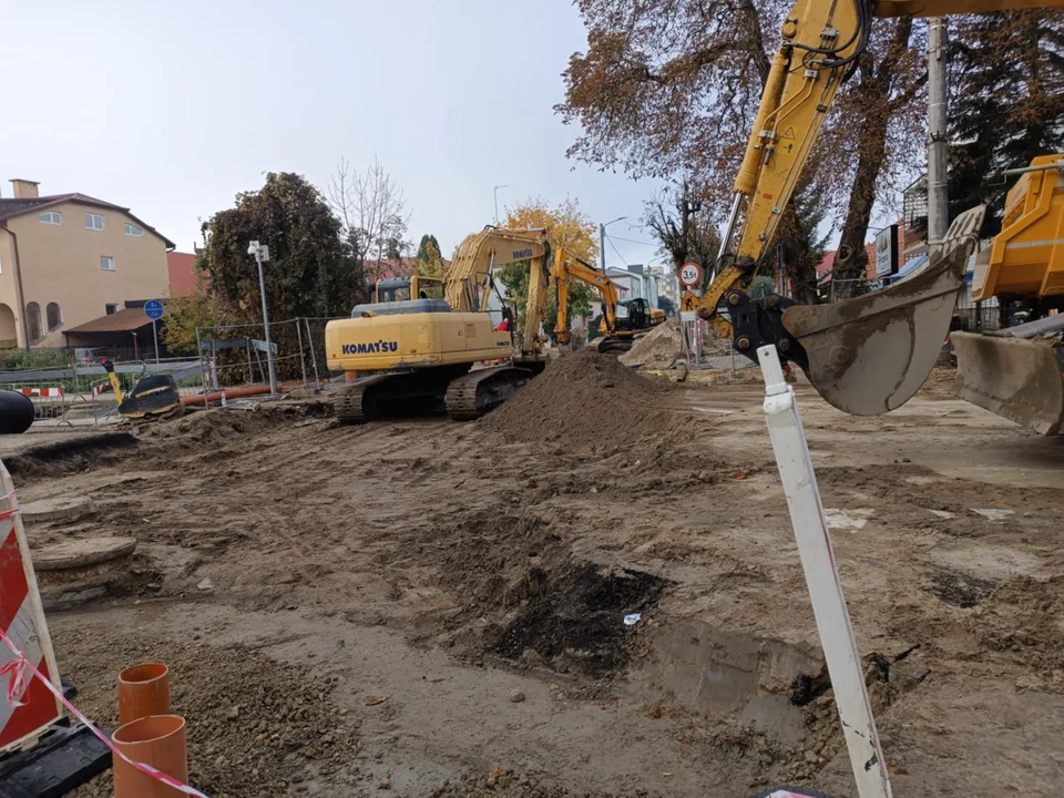 Prace postępują,w ubiegłym tygodniu informowaliśmy o rozpoczęciu prac. Postępują dalej, obecnie zamknięry dla pieszych jest chodnik przy ul. sSowackiego od srony zachodniej. Przejść można od storny wschodniej. Rozkopane są ulice Chopina i Parkowa.