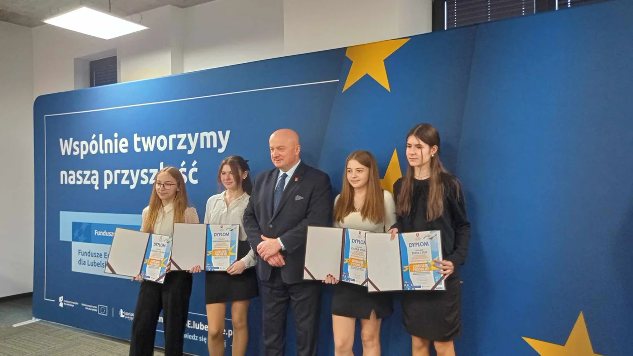 29.11.2024 roku mieliśmy zaszczyt uczestniczyć w uroczystej gali rozdania nagród w konkursie wojewódzkim „Lubelskie pięknieje - jak fundusze europejskie zmieniają oblicze Lubelszczyzny”. Uczennice klasy 2m: Joanna Mitura, Aleksandra Obroślak i Zofia Zyga oraz Aleksandra Goral z klasy 2L otrzymały nagrody i dyplomy z rąk Marszałka Województwa Lubelskiego Jarosława Stawiarskiego. Komisja konkursowa wyłoniła nasze laureatki z grona 284 autorów prac plastycznych nadesłanych przez uczniów z Lubelszczyzny. Jesteśmy dumni z sukcesu naszych uczennic. Obszerna relacja medialna i reporterska będzie dostępna w Polskim Radiu Lublin oraz w Telewizji Polskiej oddział regionalny w Lublinie. Opiekunem artystycznym uczennic była Beata Józefaciuk, nauczyciel plastyki i wychowawca klasy 2m. Prace konkursowe były wykonane na zajęciach koła plastycznego w Zespole Szkół nr 2 w Lubartowie.