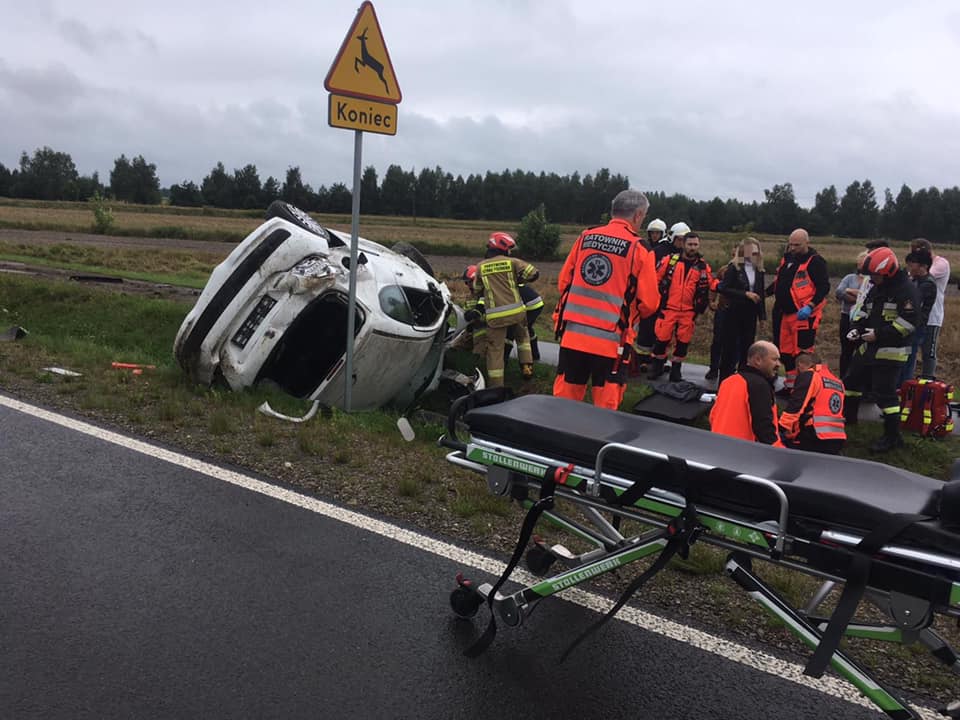 Podczas dachowania samochodu na drodze wojewódzkiej dwie osoby zostały poszkodowane. W akcji na miejscu zdarzenia brały udział zastępy JRG Lubartów i OSP Niedźwiada, Zespół Ratownictwa Medycznego,patrol Policji.
