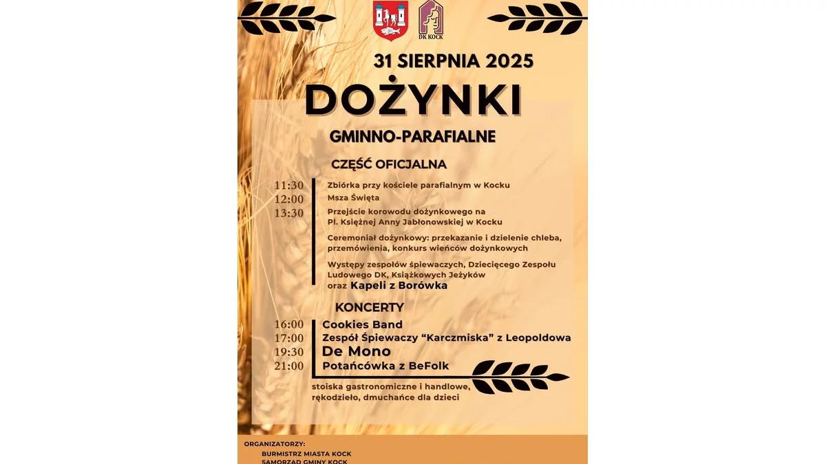 Dożynki rozpoczną się o godz. 12 mszą świętą w kościele parafialnym w Kocku. Po mszy, około godz 13.30 korowód dożynkowy przejdzie na Plac Księżnej Anny Jabłonowskiej. Tam nastąpi część oficjalna: wystąpienia, ceremoniał dożynkowy, konkurs wieńców. Będą występowały zespoły śpiewacze, Dzieciecy Zespół Ludowy DK, Książkowe Jeżyki i Kapela z Borówka.