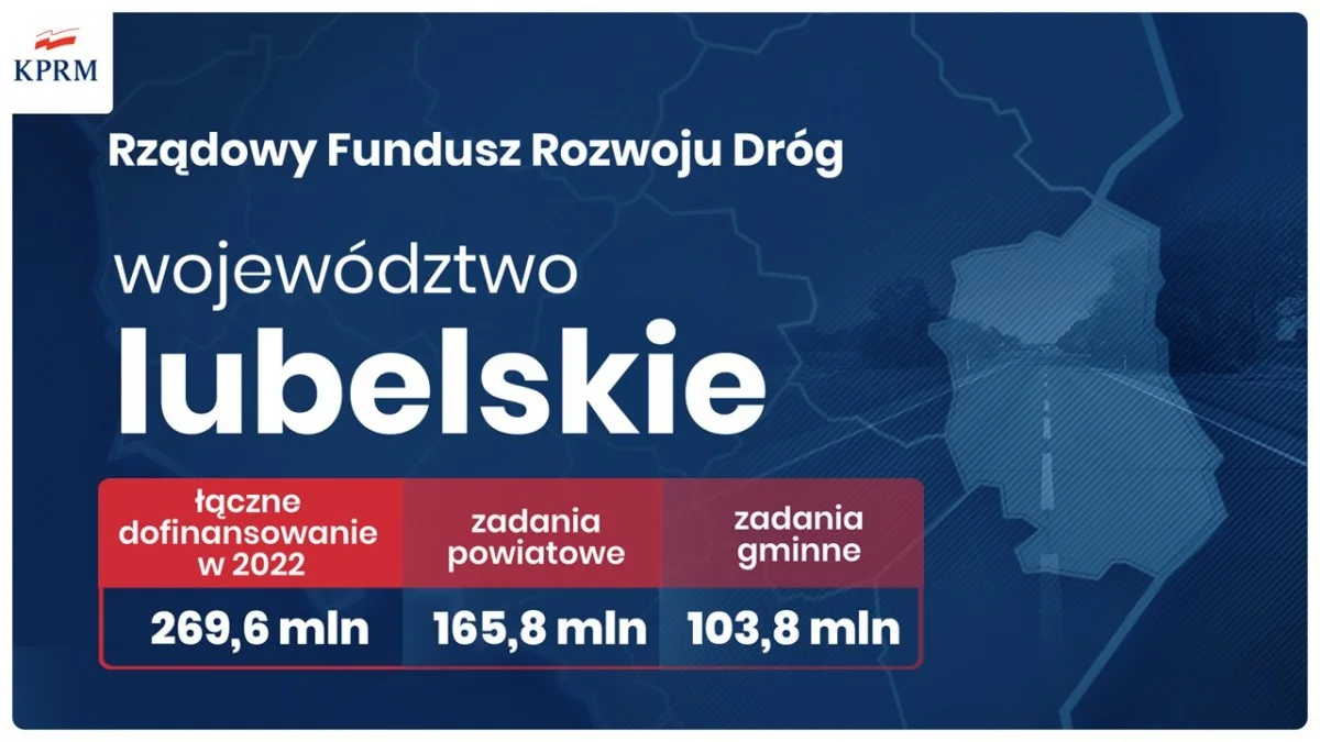 Województwo lubelskie otrzymało dofinansowanie w kwocie łącznie 269,6 mln zł, z tego na zadania powiatowe - 165,8 mln zł, na gminne - 103,8 mln zł.