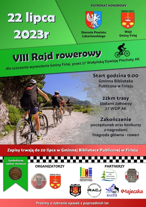 Również 22 lipca ruszy rajd w Firleju. Organizuje go gmina Firlej, Koło Historyczne Armii Krajowej w Firleju, Gminna Biblioteka Publiczna w Firleju, OSP Firlej. Rajd ruszy o godz. 9 spod biblioteki. Rowerzyści pojadą leśnymi drogami na budy i pod pomnik 27 WDPAK w Firleju. Odwiedzą na cmentarzu parafialnym grób szer. Karpowicza - żołnierza 27 WDPAK poległego pod Firlejem w walce z Niemcami oraz krzyż w miejscu jego pierwotnego pochówku. Na terenie plałacu myśliwskiego hrabiego Żółtowskiego odbędzie się piknik, będzie konkurs wiedzy o 27 WDPAK. Będzie kilkanaście nagród ufundowanych przez wójta gminy Firlej Dawida Tarnowskiego, w tym nagroda główna - rower.