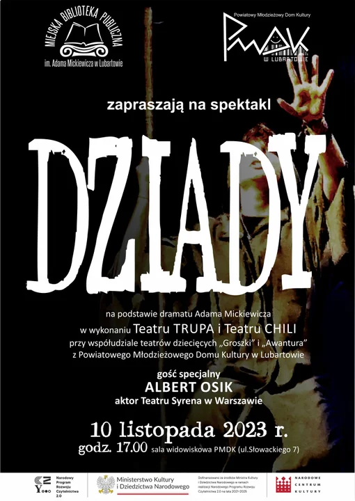 Na spektakl "Dziady" na podstawie dzieła Adama Mickiewicza zapraszają Miejska Biblioteka Publiczna i Powiatowy Młodzieżowy Dom Kultury. Wystąpią działające w PMDK Teatr Trupa i Teatr Chili oraz teatry dziecięce Groszki i Awantura.