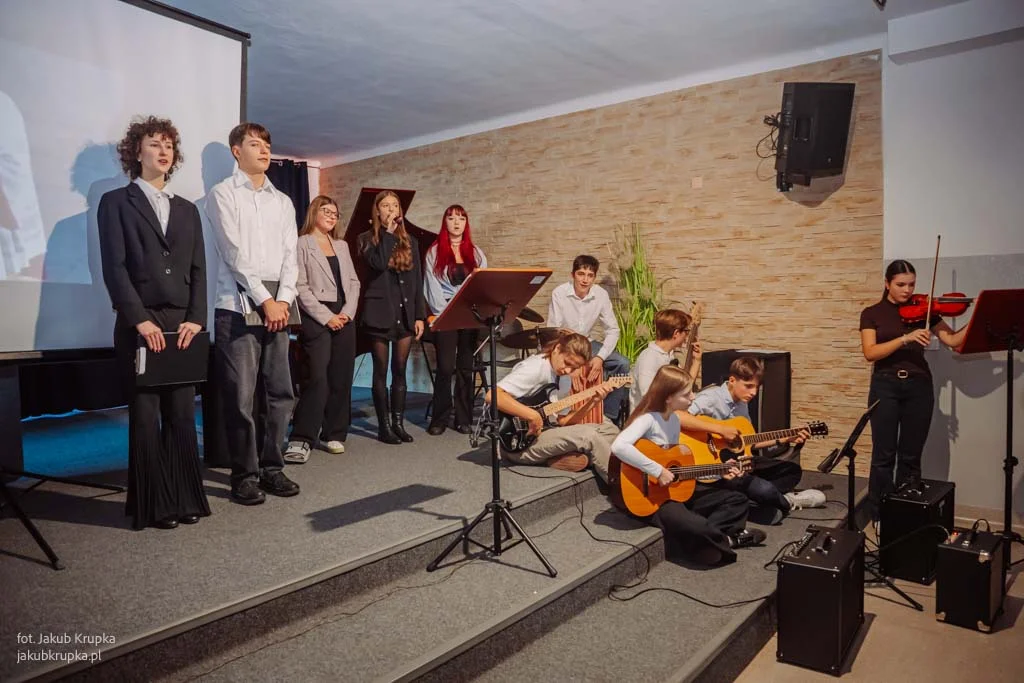 Podczas uroczystości wystąpił szkolny zespół muzyczny, który wzruszająco wykonał pieśni religijne i utwory inspirowane nauczaniem św. Jana Pawła II, obejrzeliśmy archiwalne nagrania – moment wyboru Karola Wojtyły na papieża w 1978 roku, jego pielgrzymki do Polski i spotkania z wiernymi. Ponadto prowadzący uczniowie z zaangażowaniem odczytali najważniejsze wydarzenia z życia Karola Wojtyły – od dzieciństwa w Wadowicach, przez lata kapłaństwa, aż po pontyfikat w Watykanie.