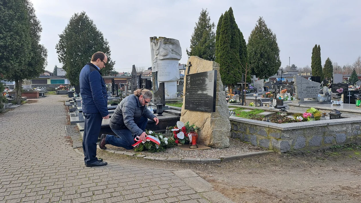 Najpierw pod pomnikiem złożyli kwiaty starosta Tomasz Marzęda i skretarz Michał Rola.