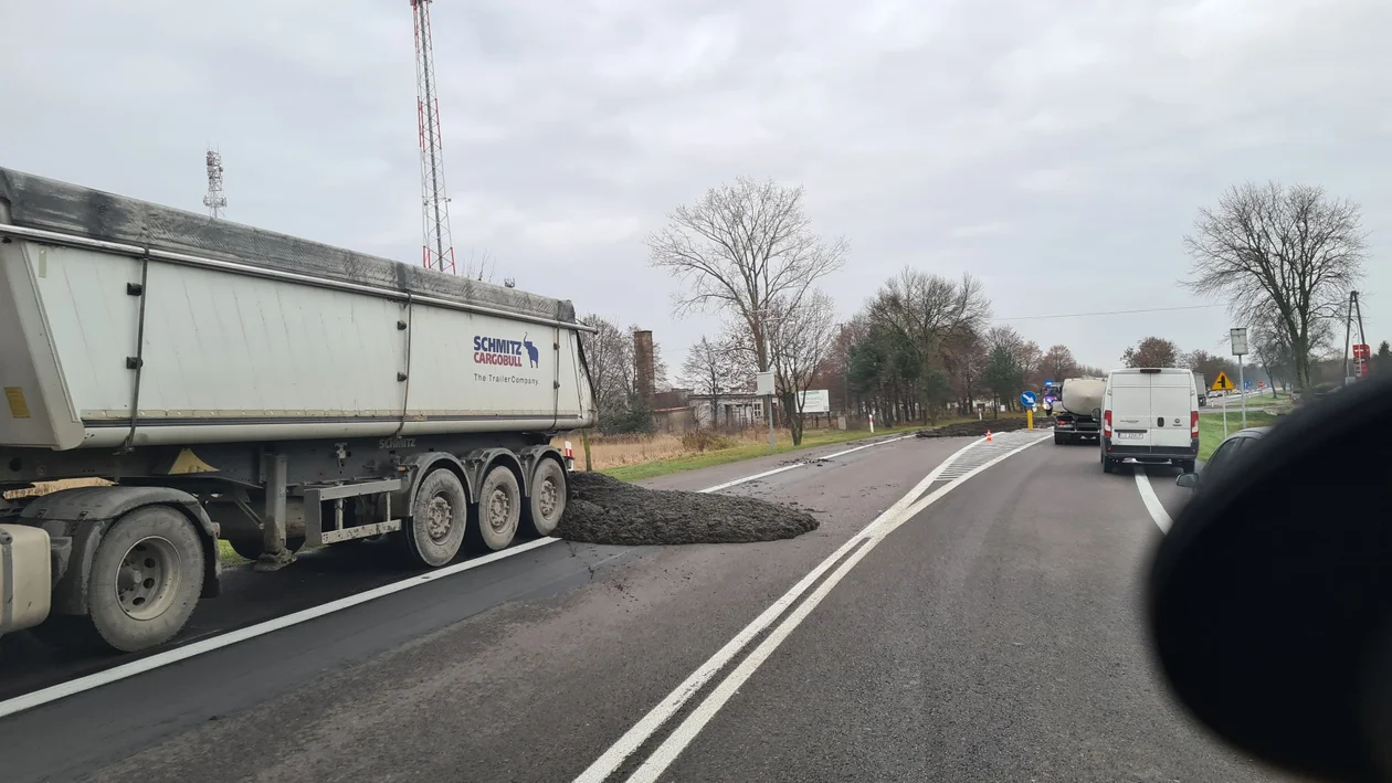 Frakcja sucha z biogazowni pokryła drogę w Firleju. Zablokowała "dziewiętnastkę"