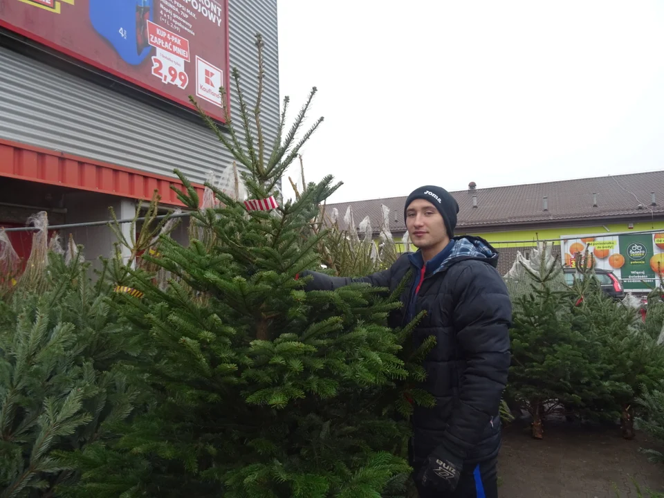 Radą służy sprzedawca Mateusz Wójtowicz, który prowadzi handel choinkami pod sklepem Kaufland. W rozmowie z naszym reporterem podano również ceny oraz wysokość jodły i świerka.