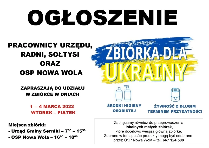Od dzisiaj do piątku trwa zbiórka darów dla Ukrainy w Urzędzie Gminy w Sernikach w godzinach 7.30 - 15.30 oraz w świetlicy OSP w Nowej Woli w godzinach 16 - 18. Gmina zachęca też do mniejszych zbiórek, zebrane w ten sposób dary mogą być odebrane przez OSP Nowa Wola, kontakt 667 124 508.