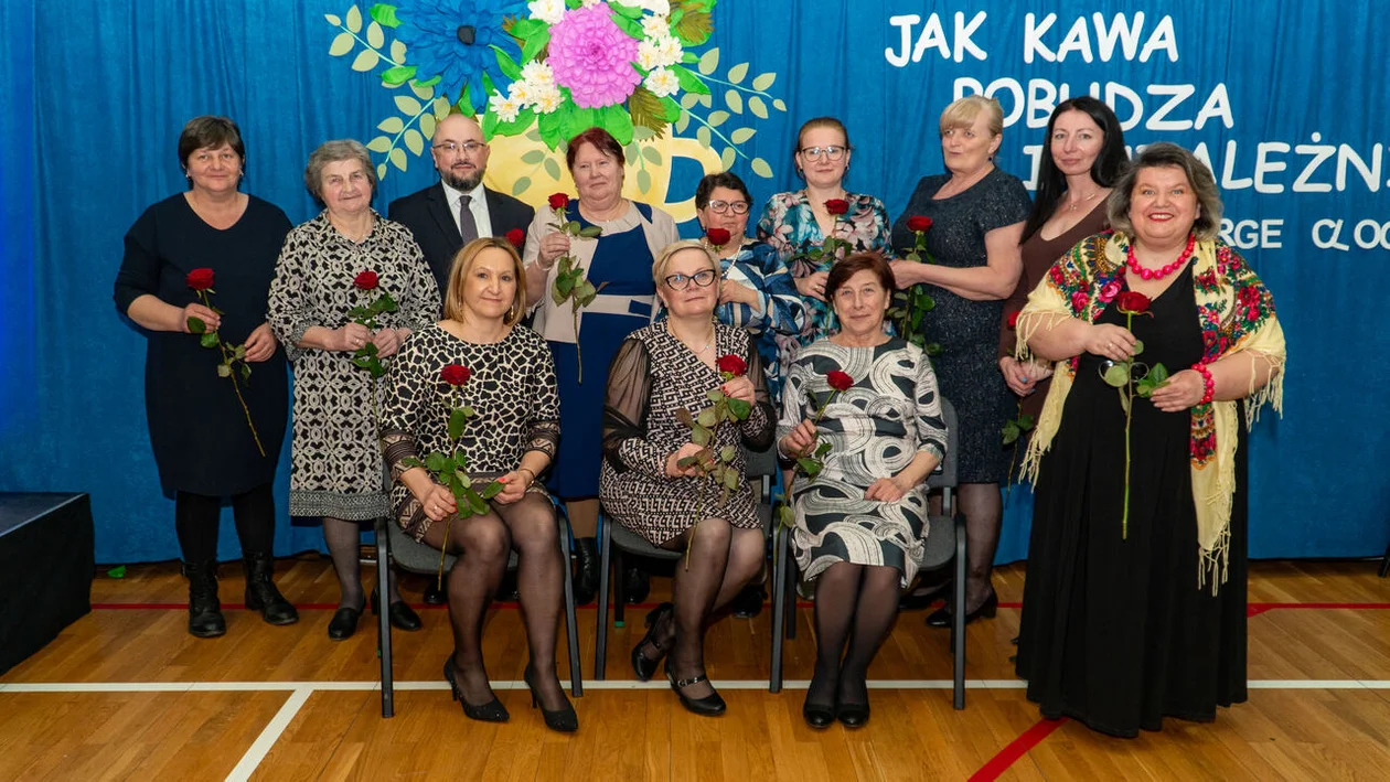 Najpierw panowie kierujący gminą - wójt Jarosław Budka, zastępca Krzysztof Dudziński i przewodniczący Rady Gminy Mariusz Goluch wręczyli róże wszystkim obecnym na sali kobietom. Wójt wręczył osobiście bukiet dyrektor szkoły Agnieszce Małysce. Złożył życzenia wszystkim paniom.