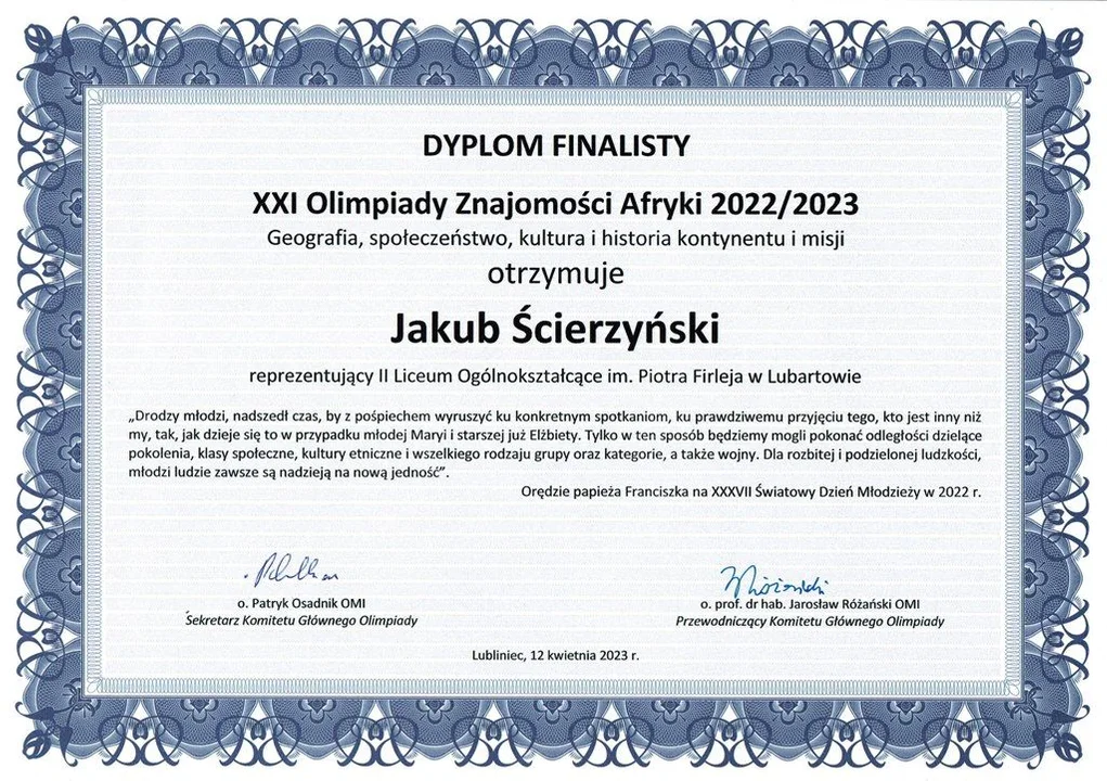 Jakub Ścierzyński z kl. IV g uzyskał tytuł finalisty XXI Olimpiady Znajomości Afryki 2022/2023.