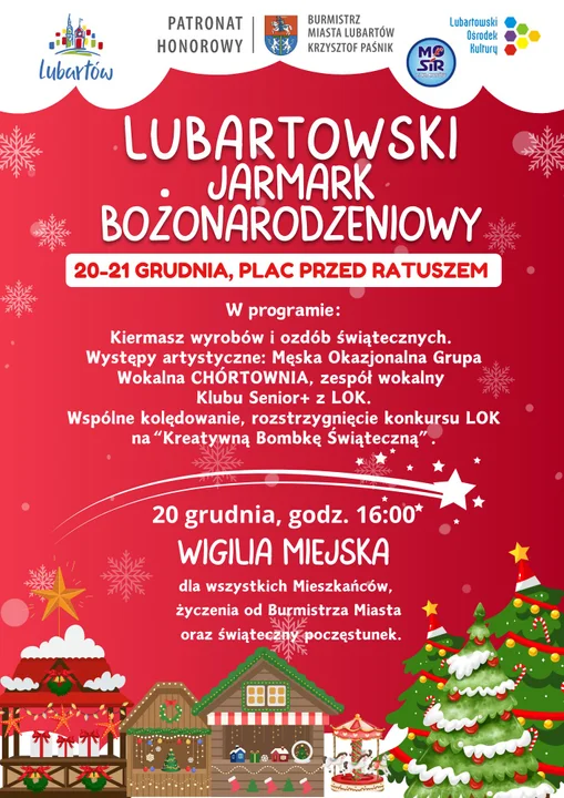 20 grudnia o godz. 16 rozpocznie się Wigilia Miejska dla wszystkich mieszkańców Lubartowa. Burmistrz Krzysztof Paśnik złoży życzenia, będzie świąteczny poczęstunek. Nie zabraknie występów artystycznych. Wystąpią Grupa Wokalna Chórtownia, zespół wokalny Klubu Senior +.
