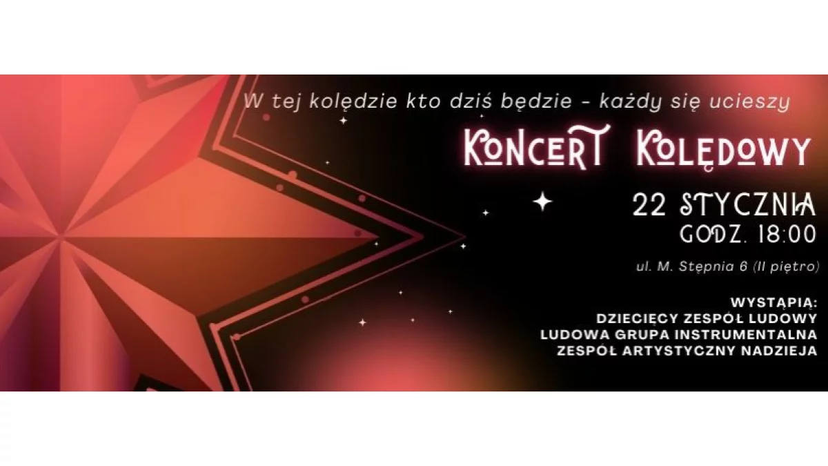Koncert rozpocznie się 22 stycznia o godz. 18. Wystąpi Dziecięcy Zespół Ludowy wraz z ludową grupą instrumentalną oraz Zespół Artystyczny „NADZIEJA”.