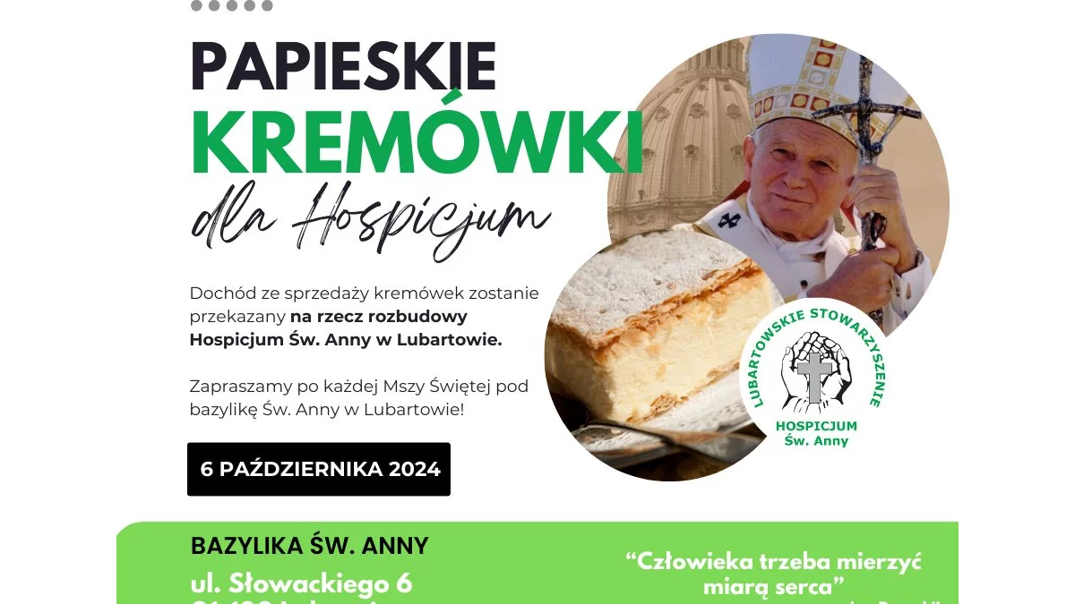 W niedzielę, 6 października po każdej Mszy św. będzie możliwość zakupienia Kremówek Papieskich do niedzielnego obiadu. Dochód ze sprzedaży będzie przeznaczony na rozbudowę naszego hospicjum - informuje parafia św. Anny w Lubartowie.