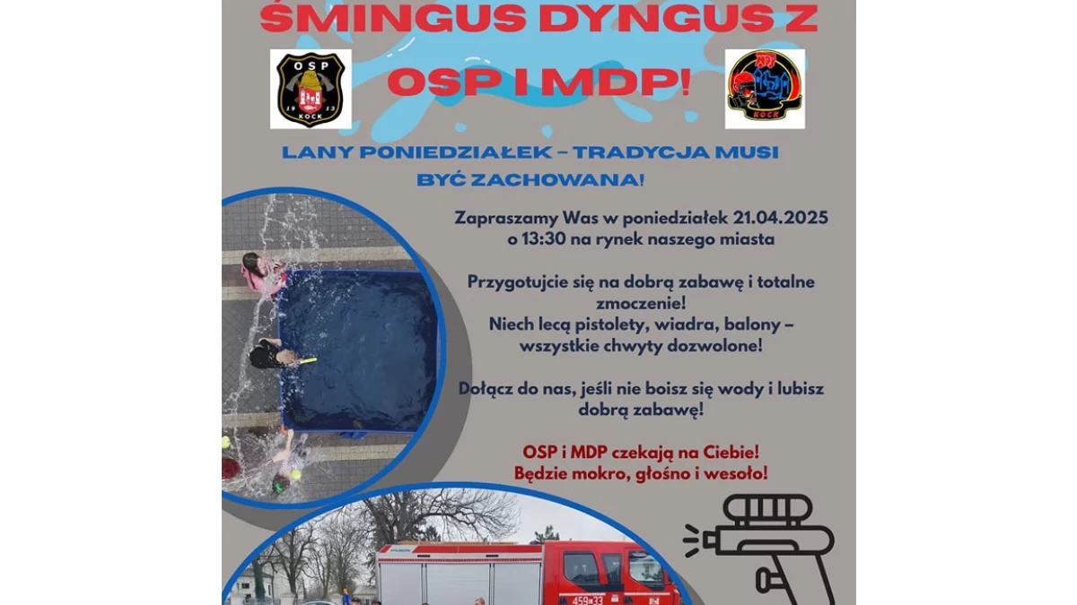 OSP i Młodzieżowa Drużyna Pożarnicza w Kocku dbają, żebu tradycja została zachowana. W poniedziałek 21 kwietnia organizują Śmigus Dyngus. Początek o godz. 13.30 na kockimm rynku. Organizatorzy zachęcają do zabrania ze sobą pistoletów na wodę, wiader, balonów. Będzie mokro i wesoło - zapowiadają.