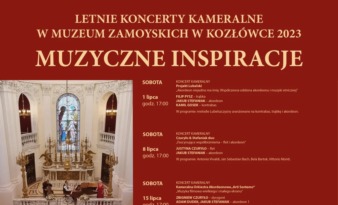 Muzeum Zamoyskich w Kozłówce zaprasza na letnie koncerty kameralne „Muzyczne inspiracje" poświęcone hrabiemu Konstantemu Zamoyskiemu, I kozłowieckiemu ordynatowi, w 120. rocznicę utworzenia ordynacji kozłowieckiej i setną rocznicę śmierci jej założyciela.