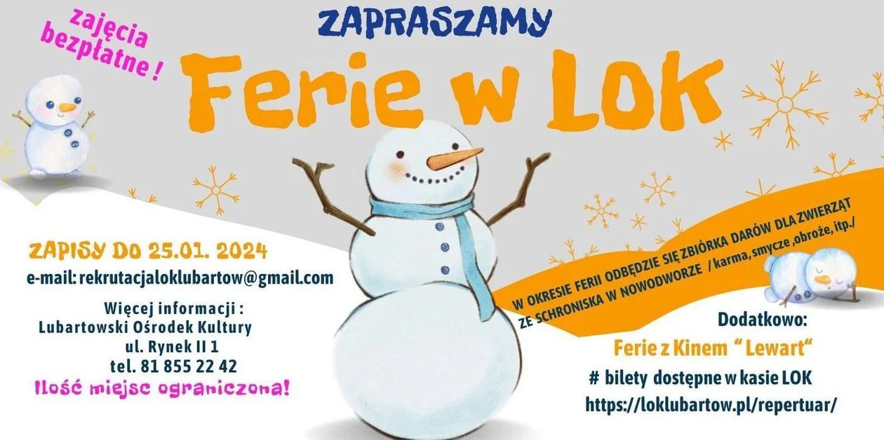 Tradycyjnie, na zajęca feryjne z LOK odbywać się będą zapisy mailowe - w tym roku do 25 stycznia.