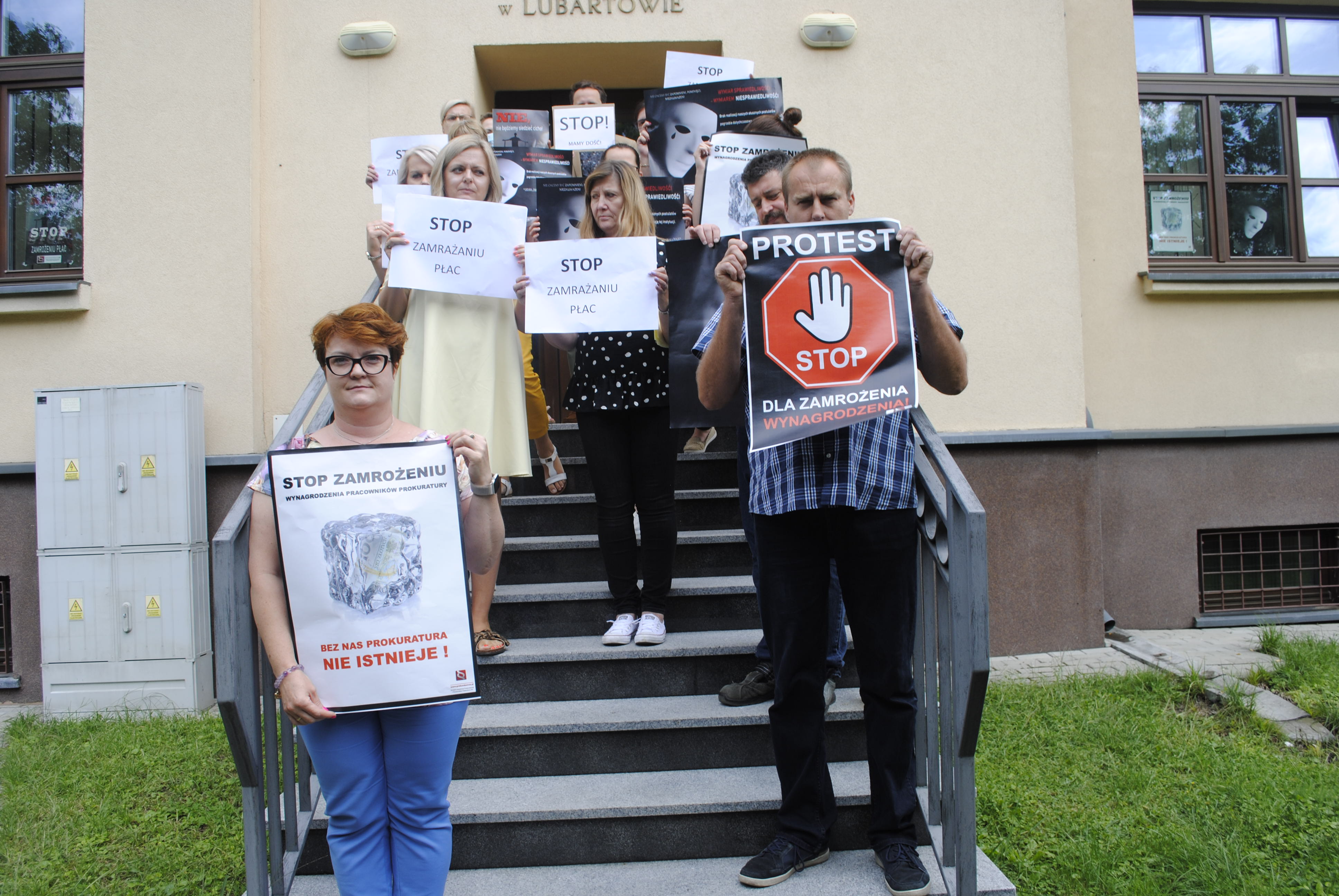 Pracownicy Sądu Rejonowego i Prokuratury Rejonowej w Lubartowie protestują przeciw zamrożeniu płac w budżetówce w 2022 r. Dzisiaj o 10.30 wyszli przed budynek sądu i prokuratury z hasłami "Stop zamrożeniu płac".
