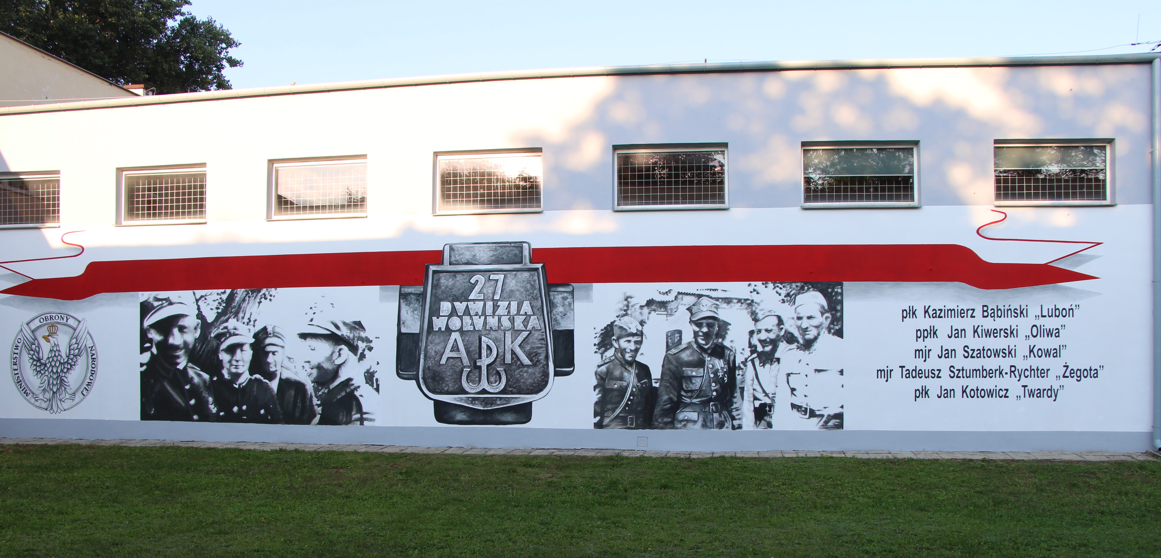 Na podstawie archiwalnych zdjęć namalowano sceny, w których uwiecznieni są oficerowie 27 Wołyńskiej Dywizji Piechoty AK. Na rysunku po lewej, wykonanym na podstawie zdjęcia zrobionego latem 1944 r. w Rudce Kijańskiej, widoczni są por. Michał Fijałka "Sokół", ppor. Mścisław Sławomirski "Prawdzic", mjr Jan Szatowski "Kowal". W scenie po prawej pokazani są rtm. Józef Ostoja - Gajewski "Tomek", mjr Tadeusz Sztumberk - Rychter "Żegota", por. Roman Romaszkan "Maria", ppor. Ryszard Pietasz "Pałysz". Scena została namalowana na podstawie zdjęcia wykonanego w lipcu 1944 r. w Ostrowie Lubelskim. Centrum muralu zajmuje odznaka 27 WDPAK, po lewej stronie jest logo MON.