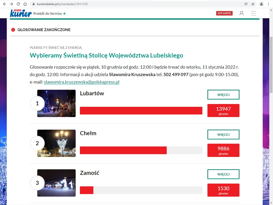 Głosowanie w plebiscycie zakończyło się 11 stycznia o godz. 12. Lubartów zdobył 13 947 głosów. Dzięki temu zdobył tytuł Świetlnej Stolicy Województwa Lubelskiego.