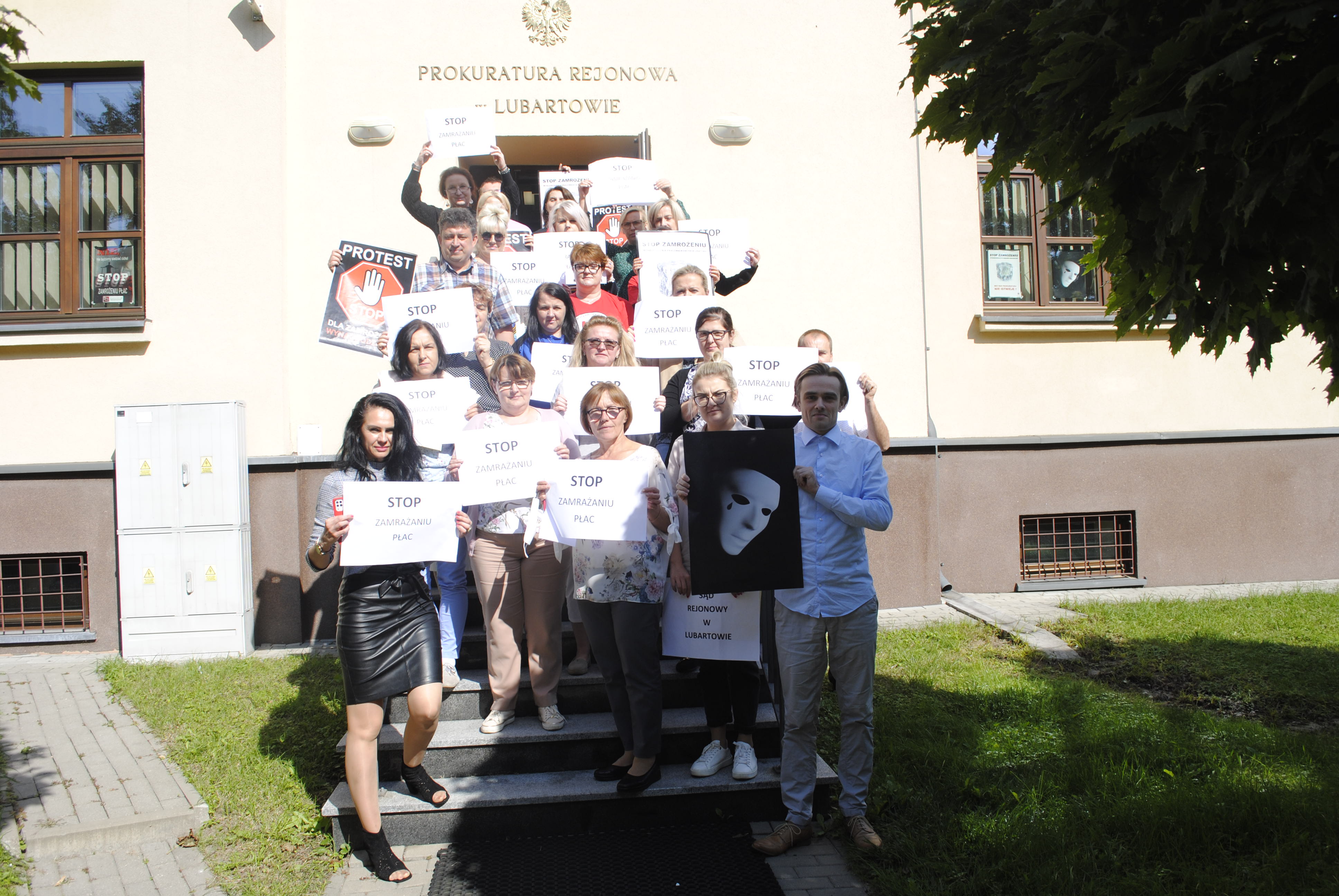 Pracownicy Sądu Rejonowego i Prokuratury Rejonowej w Lubartowie protestują przeciw planowanemu zamrożeniu płac w budżetówce w 2022 r. Akcja zaczęła się na początku sierpnia. W każdą środę w czasie przerwy pracownicy wychodzą przed budynki swoich instytucji z hasłami "Stop zamrożeniu płac". Zbierają się na przemian pod sądem i pod prokuraturą. Dzisiaj stanęli pod prokuraturą. Niektórzy mieli koszulki przygotowane na protest przez związki zawodowe. Kolejny protest odbędzie się w piątek. W tym dniu odbędzie się też ogólnopolska akcja protestacyjna w Warszawie. Jeśli akcja nie przyniesie sutków w postaci odmrożenia płac, związki zawodowe zadecydują, czy i w jakiej postaci będą się odbywały kolejne protesty.