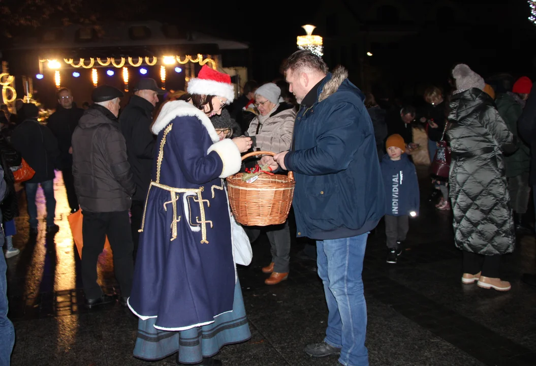 Trwa miejska Wigilia. Burmistrz Krzysztof Paśnik złożył życzenia mieszkańcom, odczytał fragment Pisma Świętego o narodzeniu Jezusa. Ks. Andrzej Juźko udmówił modlitwę, modlił się o pokój w rodzinach i pokój na Ukrainie. Na scenie byli także zastępca burmistrza Tadeusz Mayłska, przewodniczący Rady Miasta Grzegorz Gregorowicz, starosta Tomasz Marzęda, o. gwardian Wojciech Gwiazda z klasztoru oo. Kapucynów.