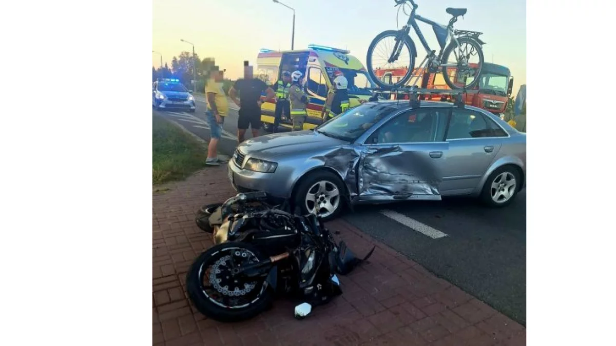 Jak informuje policja, motocyklista jadący motocyklem marki Kawasaki nieprawidłowo wyporzedzał Audi, którego kierowca rozpoczął manewr zawracania. Motocykl uderzył w samochód.