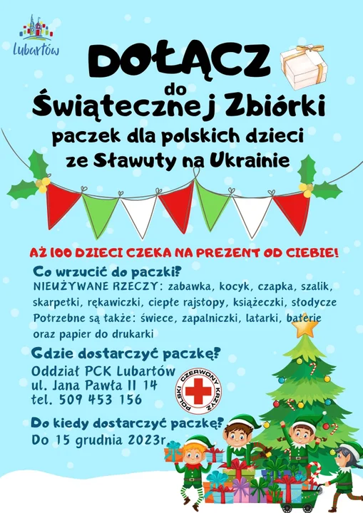 Związek Polaków na Ukrainie prosi o pomoc w zorganizowaniu paczek świątecznych dla ponad stu polskich dzieci. W paczce mogą być np.: koce, rękawiczki, czapki, szaliki, skarpetki, ciepłe rajstopy, książeczki, zabawki i słodycze. Prosimy, aby przynoszone rzeczy były nieużywane. Dzieci mają od 3 do 16 lat.