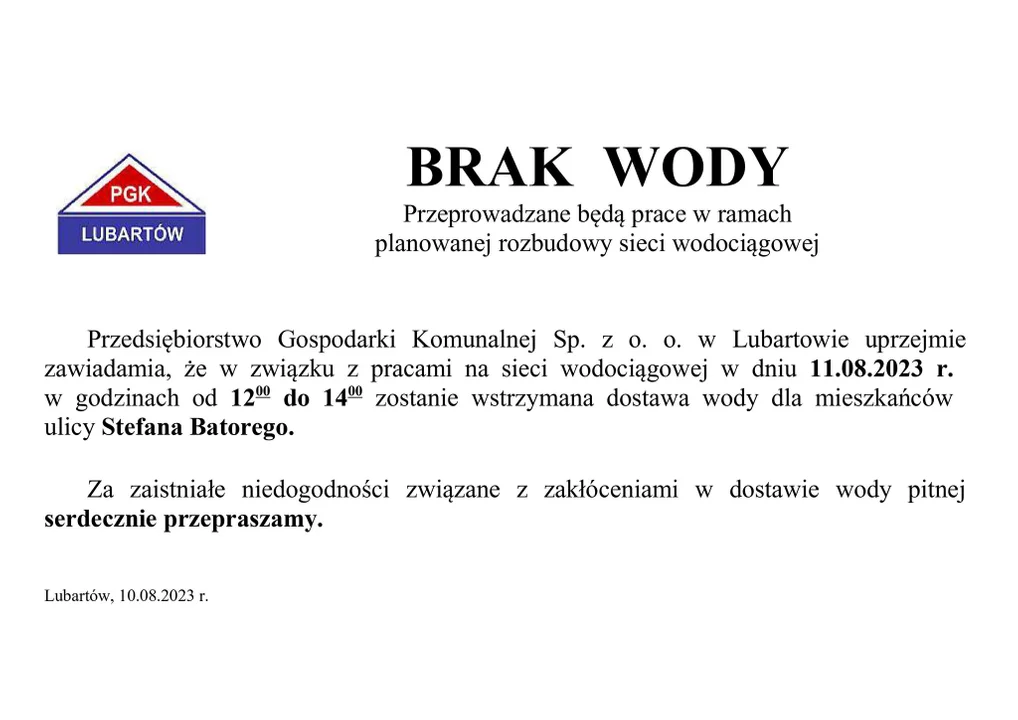 PGK w Lubartowie zawiadamia, że w związku z pracami na sieci wodociągowej 11 sierpnia w godzinach 12 - 14 zostanie wstrzymana dostawa wody dla mieszkańców ul. Stefana Batorego.