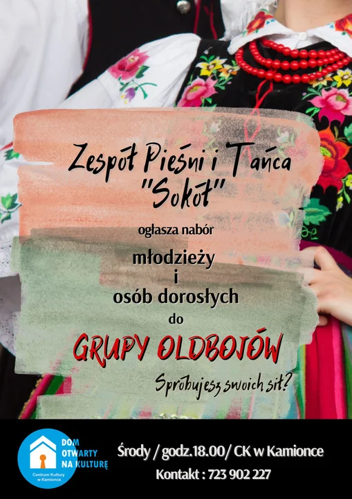 Zespół Pieśni i Tańca "Sokół" działający przy Centrum Kultury w Kamionce ogłasza nabór tancerzy do najstarszej grupy wiekowej - młodzieży od 18 lat i osób dorosłych.