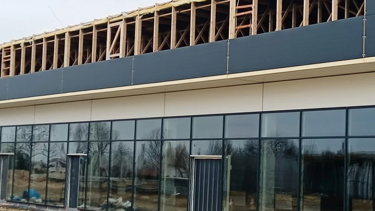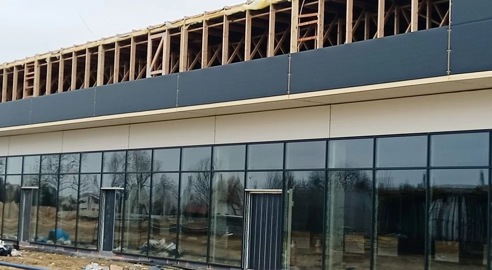 Byliśmy na miejscu budowy, gdzie widać prace związane ze wstawianiem oszklonych ścian wybudowanego już budynku, a także prace wznoszenia szkieletów dwóch nowych. W pobliżu znajdować ma się także zbiornik wód odpadowych.