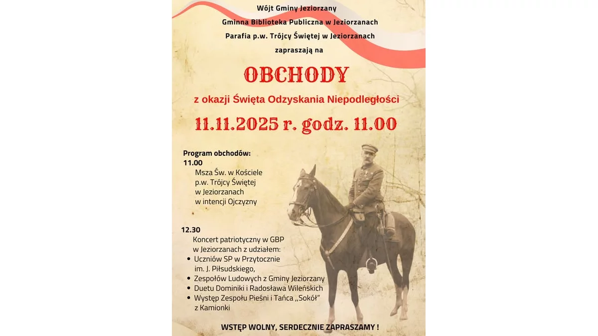 Uroczystości z okazji Święta Niepodległości przygotowują wspólnie Wójt Gminy Jeziorzany Katarzyna Pietzak, Gminna Biblioteka Publiczna w Jeziorzanach oraz Parafia p.w. Trójcy Świętej w Jeziorzanach. Obchody zaplanowano na wtorek 11 listopada. Rozpoczną się o godz. 11.