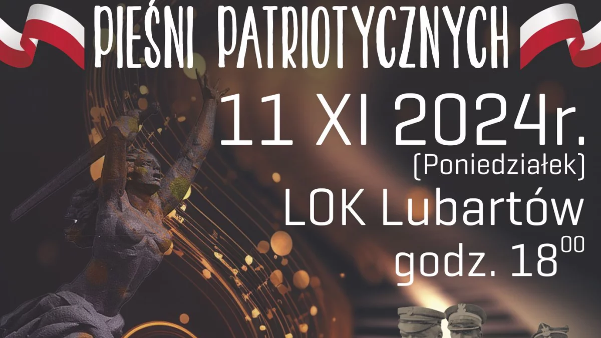 Serdecznie zapraszamy mieszkańców Lubartowa na XIII Wspólne Śpiewanie Pieśni Patriotycznych, które odbędzie się 11 listopada o godz. 18:00 w sali kina „Lewart".