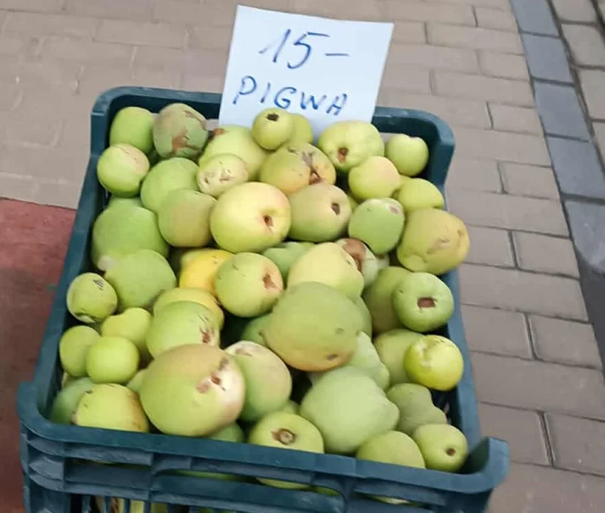 Pigwa, z której owoców można zrobić nalewkę albo syrop do herbaty była jednym z owoców do kupieni adzisiaj na targu. Ceny owoców i warzyw są różne u poszczególnych sprzedawców, np. ceny cebuli cukrowej różnią się nawet o 2 zł.