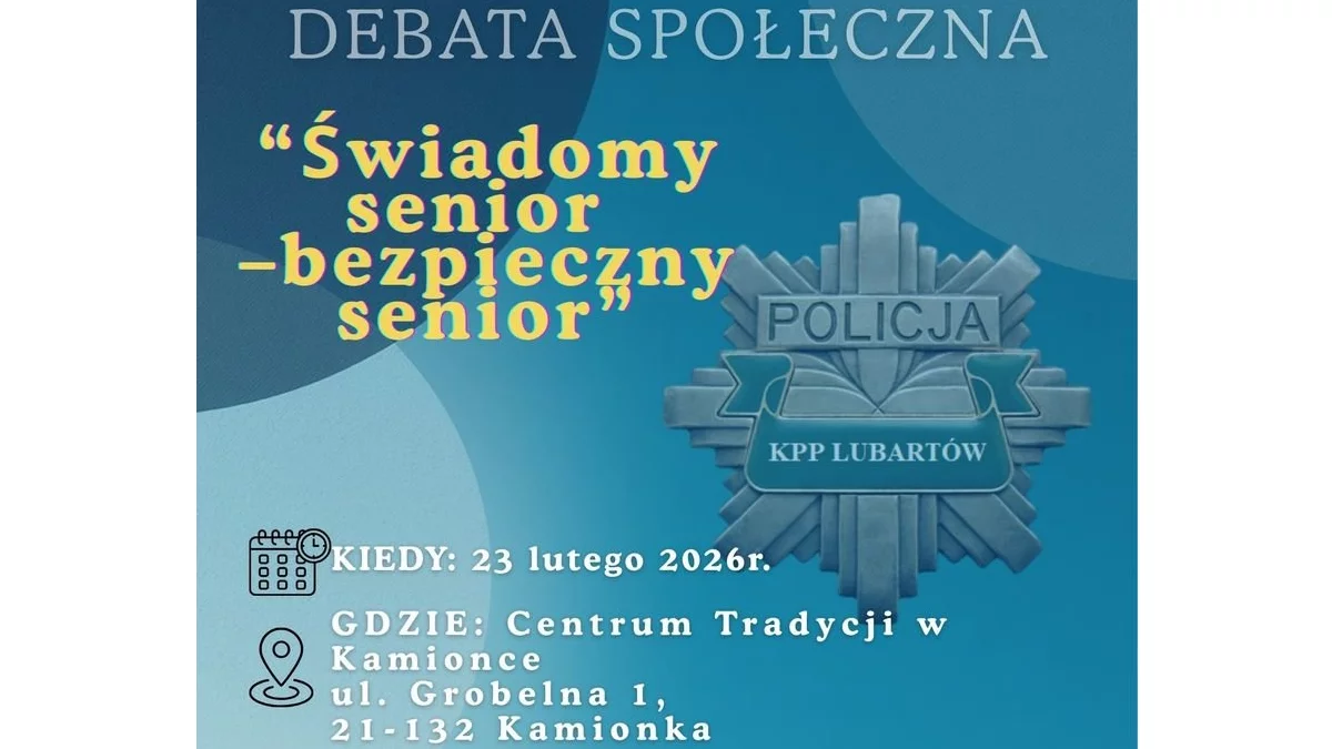 „Świadomy senior – bezpieczny senior" to tytuł debaty społecznej, na którą policja zaprasza 23 lutego o godz. 15. Debata odbędie się w Centrum Tradycji w Kamionce przy ul. Grobelnej 1.