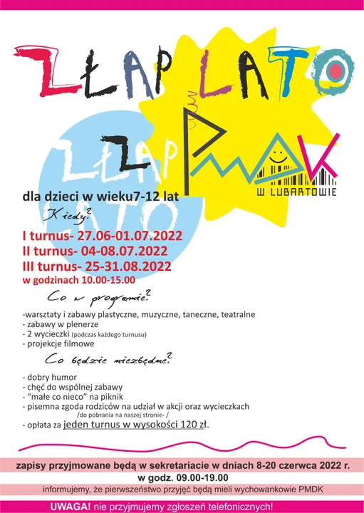 W PMDK w Lubartowie zwolniło się kilka miejsc na ostatni turnus półkolonii (25,26 i 29-31 sierpnia, składka na wycieczki i materiały: 120 zł) . Placówka zaprasza chętnych do zgłaszania się do sekretariatu PMDK tel. 81 855 3786. Półkolonie przeznaczone są dla dzieci w wieku 7-12 lat, które będą mogły skorzystać z wycieczki Nadwiślańską Kolejką Wąskotorową , warsztatów w Stajni Stanka, spotkania profilaktycznego z policjantem z KPP w Lubartowie i zajęć artystycznych z nauczycielami PMDK.