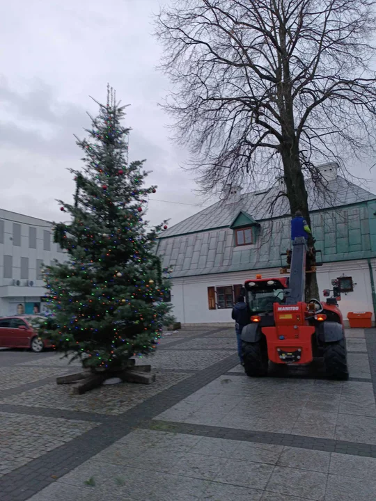 Na placu przed ratuszem w Lubartowie wiatr przewrócił miejską choinkę. Przewrócone drzewko postawili z powrotem pracownicy PGK