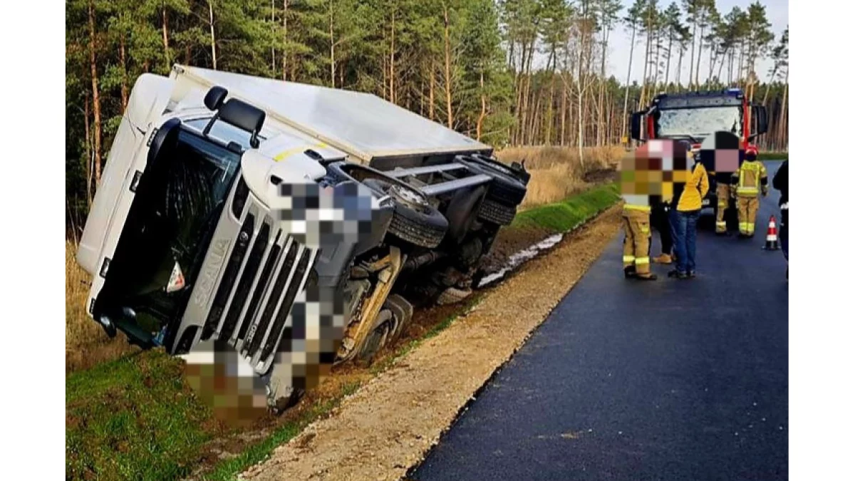 Wczoraj około godz. 9 w Annówce w gminie Kock kierowca ciężarowej Scanii nie dostowował prędkości do warunków na remontowanym odcinku S 19. Pojazd zjechał na nieutwardzone pobocze drogi i wywrócił się.