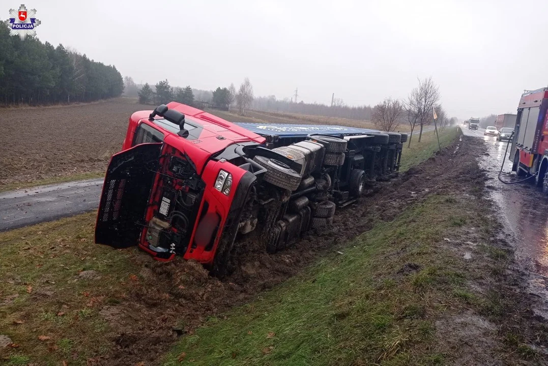 Do drugiego zdarzenia doszło po godzinie 13 również na drodze krajowej numer 19, na obwodnicy Lubartowa, za skrzyżowaniem z Alejami Zwycięstwa. Jak wstępnie ustalili mundurowi, kierujący ciężarówką wskutek nie zachowania odpowiednich środków ostrożności, zjechał na pobocze, które okazało się grząskie. Doszło do wywrócenia ciągnika wraz z kontenerem. Kierowca był trzeźwy i nie odniósł żadnych obrażeń. Mogą występować czasowe utrudnienia w ruchu pojazdów.