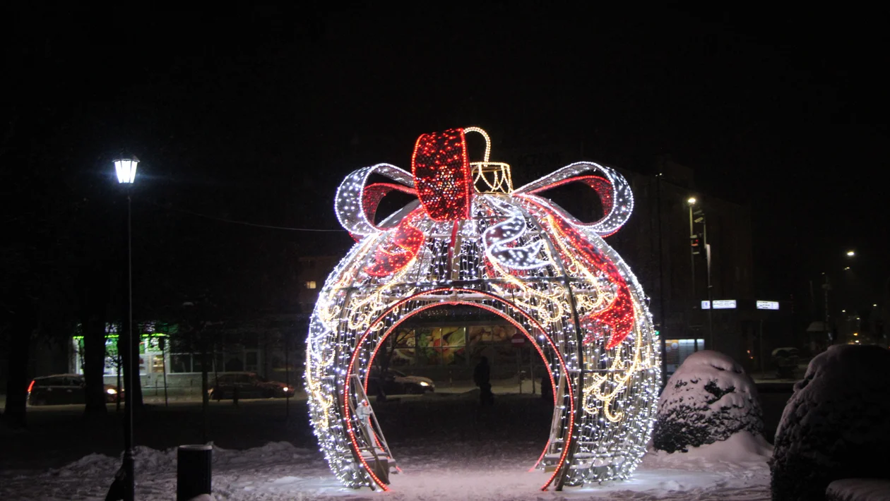 W Lubartowie świecą już ozdoby świąteczne - choinka na Placu Piłsudskiego, Mikołaj na nartach w Rynku i lilia na fontannie.