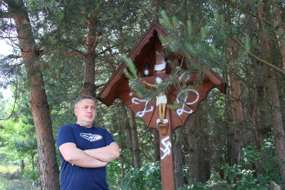 - Ludzie tu przychodzą się modlić, wyciszyć - mówi radny Żmuda. - W sobotę około godz. 16 przejeżdżałem obok, zauważyłem, że kapliczka jest pomazana - mówi. Na krzyżu ktoś namalował sprayem hitlerowskie swastyki, twarz Jezusa pomazał białą farbą.