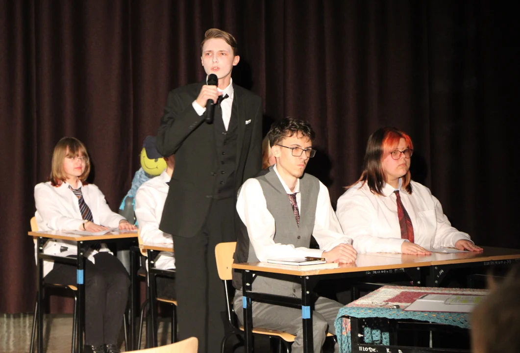 Spektakl zwieńczyła scena z "Ferdydurke" Witolda Gombrowicza - słynna lekcja języka polskiego, będąca zjadliwą na system szkolny.