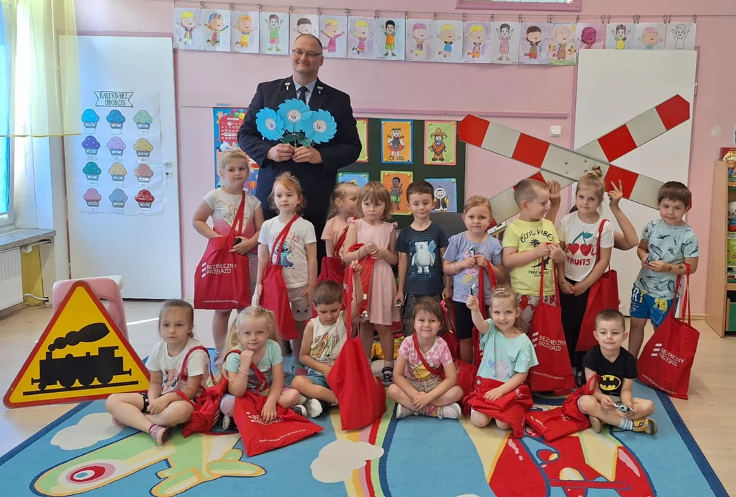 W piątek 6 czerwca dzieci z Przedszkola Miejskiego nr 5 uczestniczyły w niezwykłym spotkaniu propagującym bezpieczne zachowania na przejazdach kolejowo - drogowych oraz terenach kolejowych. Spotkanie poprowadził tata Małgosi – Pan Jacek Mazurek, który jest pracownikiem PKP Polskich Linii Kolejowych S.A. Podczas prelekcji, którą niezwykle ciekawie prowadził Pan Jacek dzieci miały możliwość zapoznania się z zasadami bezpiecznego przekraczania przejazdów kolejowo - drogowych, bezpieczeństwa na terenach kolejowych oraz ze znakami drogowymi informującymi o zbliżaniu się do przejazdów kolejowo - drogowych. Nasz Gość przybliżył dzieciom tajniki swojego zawodu, prezentując stroje i akcesoria związane ze stanowiskami dyżurnego ruchu, dróżnika przejazdowego i strażnika ochrony kolei. Wielką radość sprawiła możliwość przymierzenia tych strojów. Nasz ekspert – Pan Jacek zaprosił dzieci do zabawy dydaktycznej w przejazd kolejowy – był to bardzo atrakcyjny sposób na edukację dzieci o bezpieczeństwie na przejazdach kolejowych. Po skończonej zabawie dzieci ochoczo przystąpiły do kolorowania przywiezionych prezentów. Serdecznie dziękujemy Panu Jackowi za przybycie i bardzo ciekawe spotkanie oraz za wspaniałe prezenty!Mamy nadzieję, że dzięki takim działaniom i poprzez naszych podopiecznych trafimy do świadomości Rodziców, którzy zawsze będą potrafili świadomie, bezpiecznie a przede wszystkim czujnie pokonywać przejazdy kolejowo – drogowe.