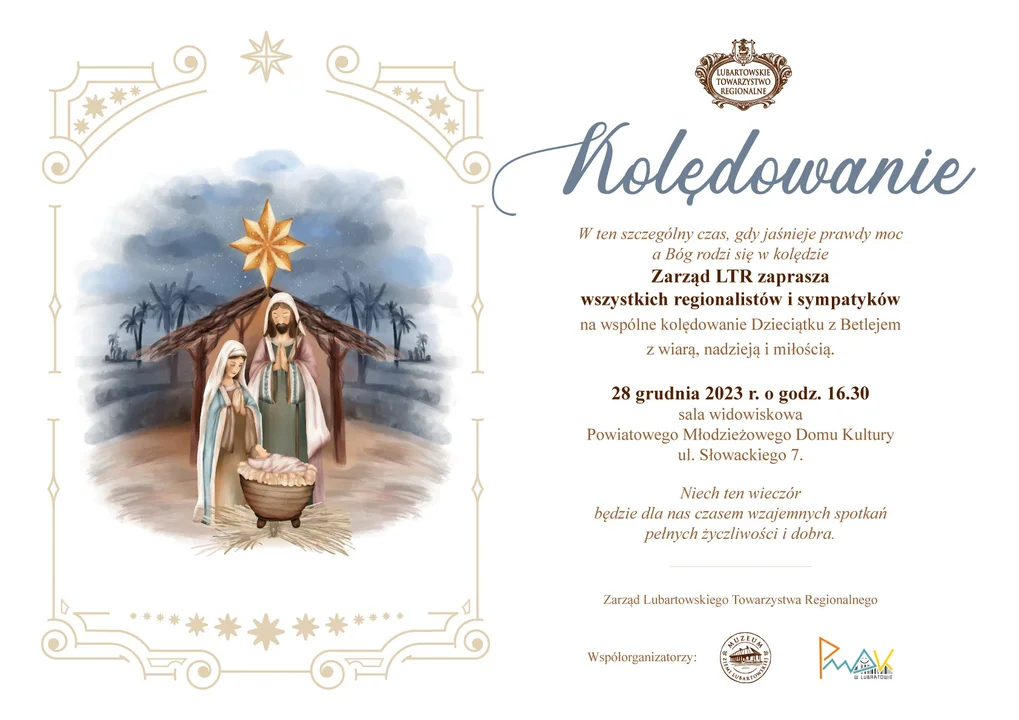 Kolędowanie regionalistów zacznie się w czwartek 28 grudnia o godz. 16.30 w sali widowiskowej PMDK - placówka będzie te,ż współorganizatorem spotkania. Kolejny współorganizator to Muzeum Ziemi Lubartowskiej.