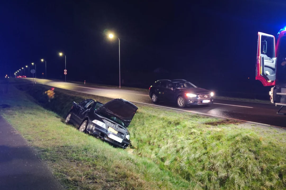 Samochód osobowy w Szczekarkowie wypadł z drogi wojewódzkiej i wjechał do rowu.