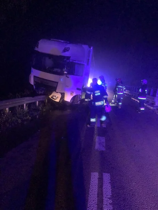Strażacy wyjechali na akcję w miejscowości Polny Młyn o godz. 0.31. Samochód ciężarowy zawisł tam na barierach. Kierowca nie odniósł obrażeń.